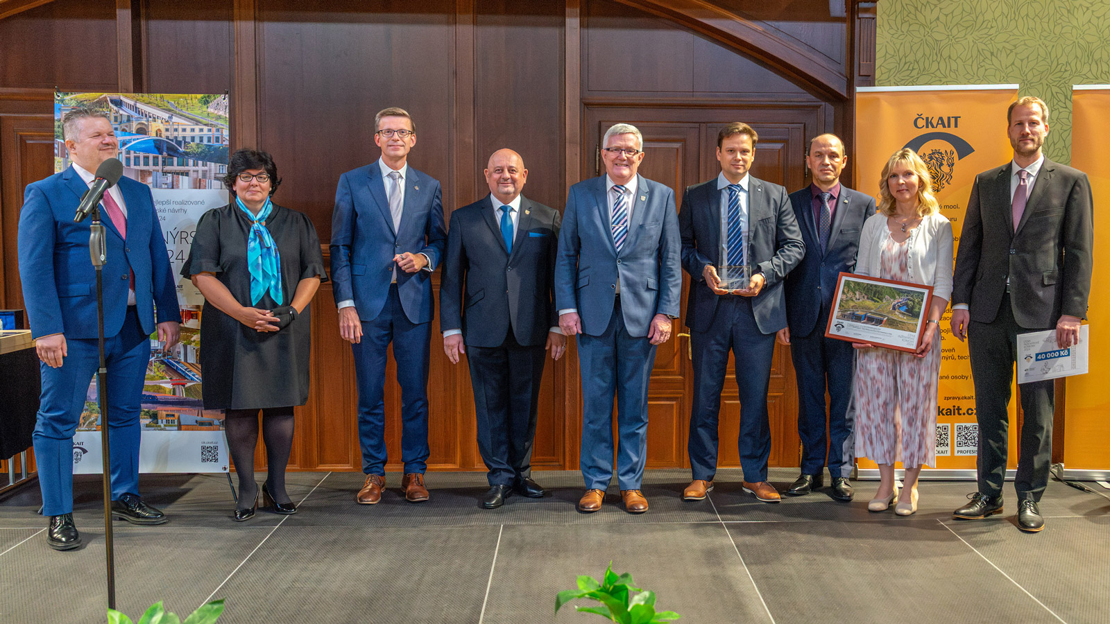 Cenu předávali: Ing. Michal Majer a Ing. Petra Bartoníčková, jednatelé PM ČKAIT, Ing. Radim Holiš, hejtman Zlínského kraje, Ing. Robert Špalek, předseda ČKAIT. Cenu přebírali: Ing. Michal Hořák, hlavní stavbyvedoucí, Jakub Navláčil, majitel a jednatel, Ing. Petr Polášek, obchodní ředitel - Navláčil stavební firma, s.r.o.. Zcela vpravo: Ing. Renata Zdařilová Ph.D., předsedkyně poroty