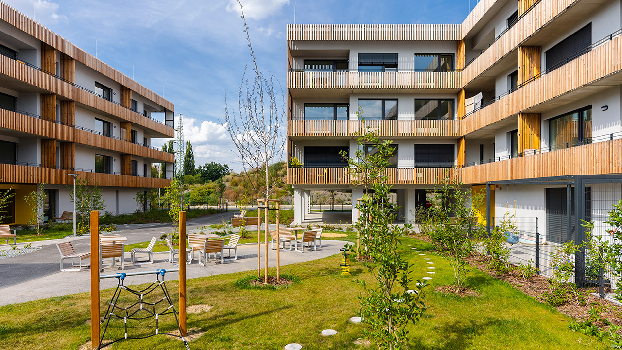 Kultivované a nápadité ztvárnění rezidenční architektury, která se prezentuje neotřelými výrazovými prostředky a současně nezapomíná na poloveřejný prostor podporující komunitní život i soukromí obyvatel. Pětice bytových domů vytváří kompaktní, ale otevřený celek, který propojuje bílá panelová fasáda směřující k řece s teplejším, dřevěným pojetím vnitrobloku. Elementární tvary, dynamické členění lodžiemi a variabilita fasád dodávají souboru osobitý výraz. Vnitroblok je navržen jako poloveřejný prostor s důrazem na zeleň, dětské hry a soukromí obyvatel, čímž vzniká příjemné a funkční obytné prostředí.