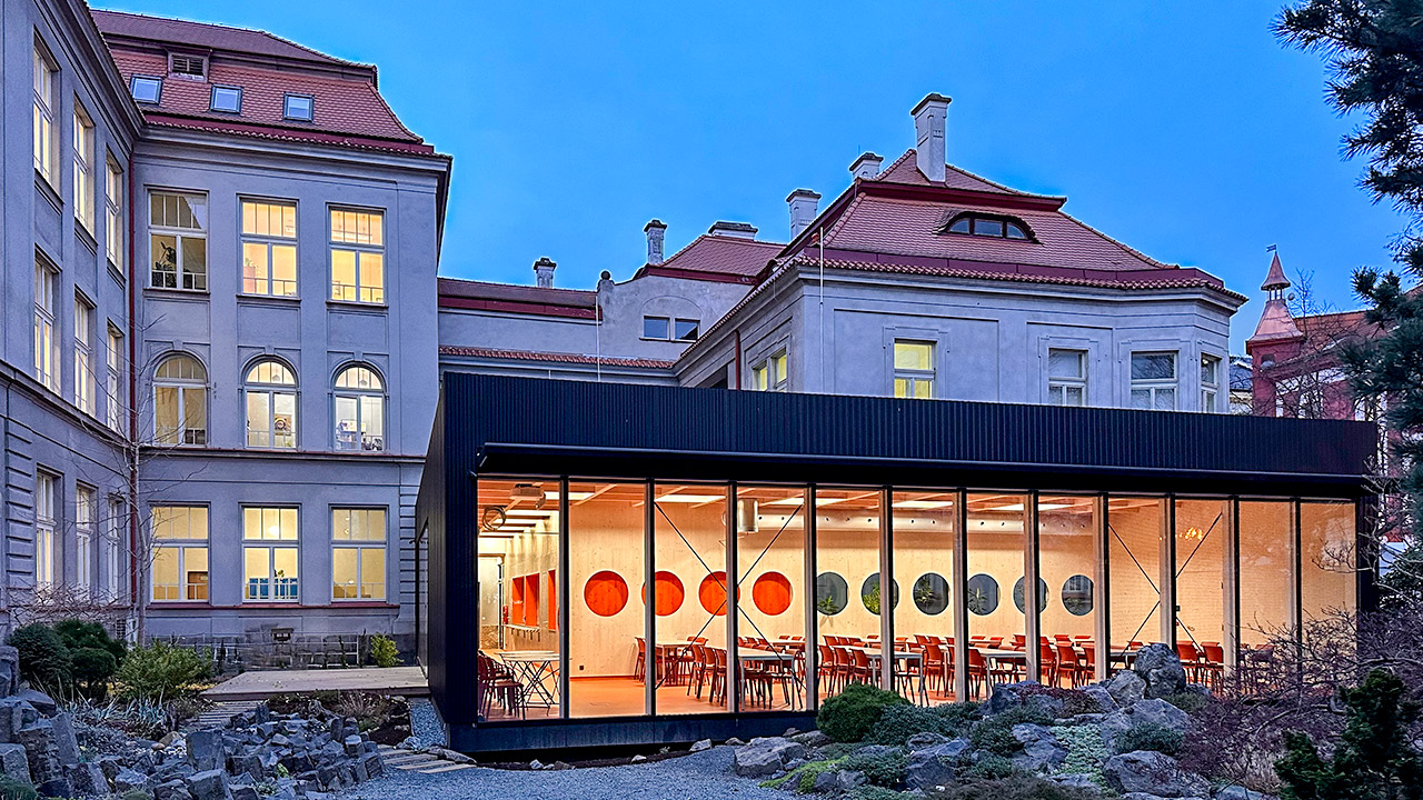 Příkladná kvalitní moderní přístavba, která prezentuje udržitelnost, funkčnost a čistotu tvaru i detailu. Vysoce ceněno je optické prolnutí vnitřní jídelny s prostorem navazující zahrady. Přístavba jídelny s kapacitou 300 obědů a 70 míst k sezení je pojata jako vzdušná moderní přízemní dřevostavba, příjemně kontrastující s těžkou hmotou historické budovy gymnázia z roku 1913. Čistota a jednoduchost tvarového řešení dávají stavbě jasný a srozumitelný výraz. Porota ocenila příjemnou decentní barevnost, důraz na akustiku vnitřních prostor a použití udržitelných materiálů, kde za zajímavost lze považovat stěny z recyklovaného papíru. Velkoplošné prosklení jídelny opticky propojuje interiér s exteriérem a poskytuje nezaměnitelný výhled do úžasné přilehlé zahrady Alpinum klub Plzeň.