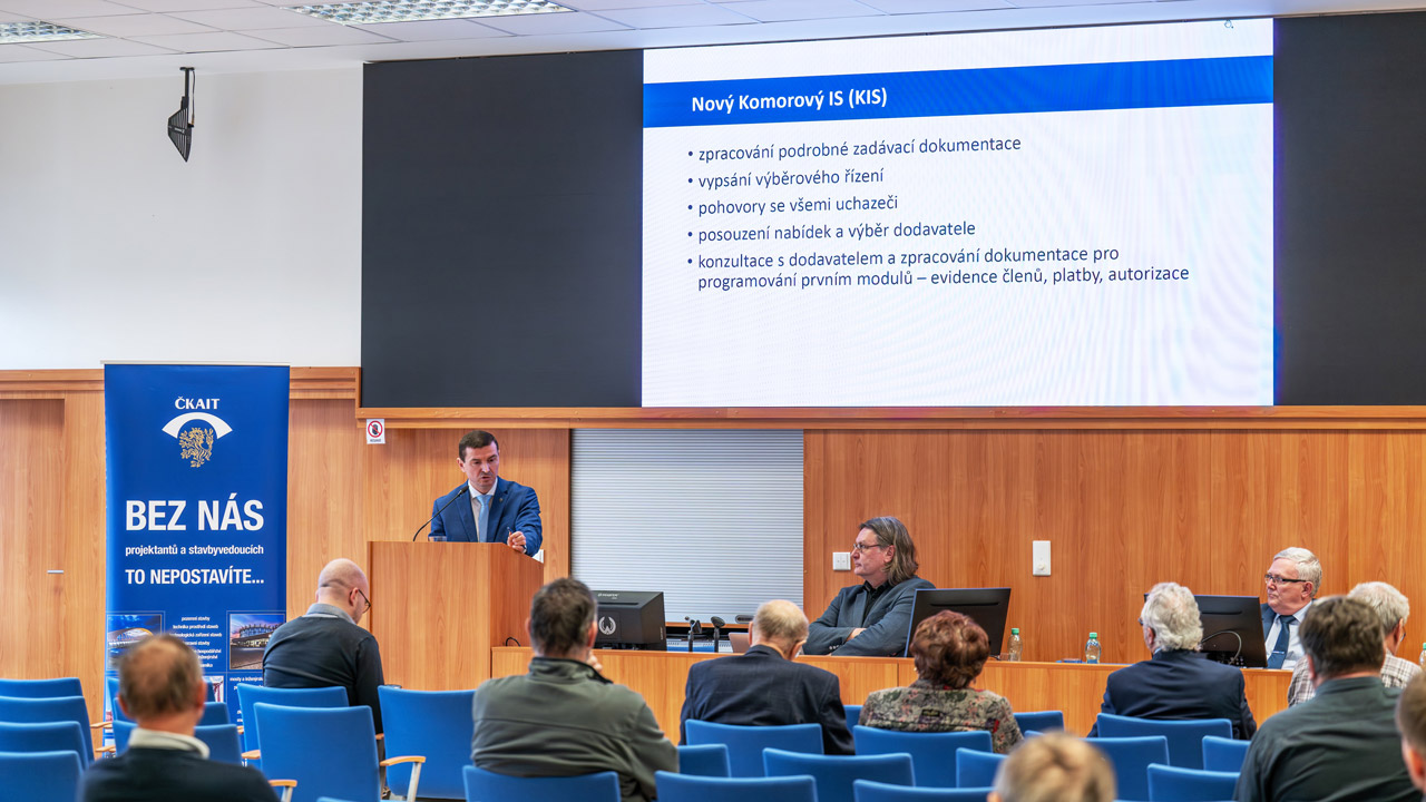 Ing. Radek Hnízdil, Ph.D., ředitel kanceláře ČKAIT, informoval přítomné o zavedení nového komorového informačního systému (KIS) a o elektronické spisové službě, která musí být zavedena do konce roku 2026. Dále seznámil členy ČKAIT s přemístěním střediska autorizací do druhé budovy ČKAIT v Legerově ul. č. 10, kde je také nově sídlo Informačního centra ČKAIT s.r.o.
